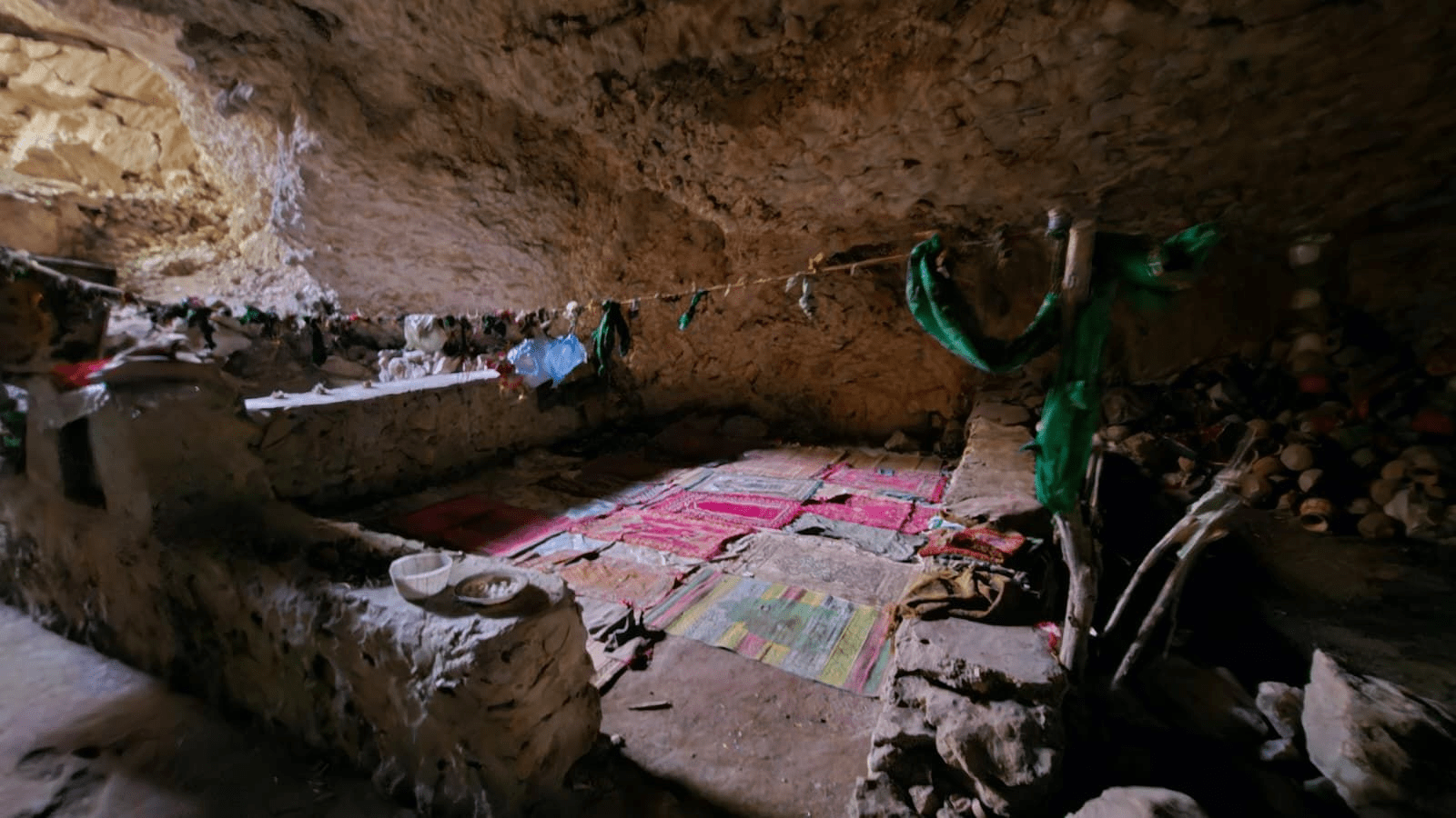 Today, the site retains an aura of serene spirituality. A small platform shaded by an old jujube tree greets visitors at the entrance, where a steel vessel often simmers with wood-fired langar. Inside, the passage narrows before opening into chambers adorned with simple hanging decorations. Devotees leave clay pots as offerings, and a prayer niche marks the space where contemplation once reigned. On clear days, sweeping views of the lake, the curved motorway, and the Chakwal hills unfold below, blending natural grandeur with sacred stillness. A malang (wandering mystic) may recite Baba Farid’s poignant shabads, their echoes filling the cave and stirring deep emotion across faiths.
