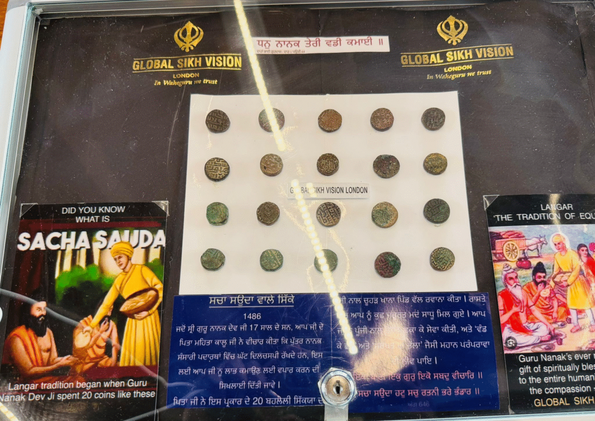 - The display includes copper coins believed to represent the exact denomination Guru Nanak Sahib used for the Sacha Sauda, his selfless act of service at age 18 that laid the foundation for the Sikh practice of langar.