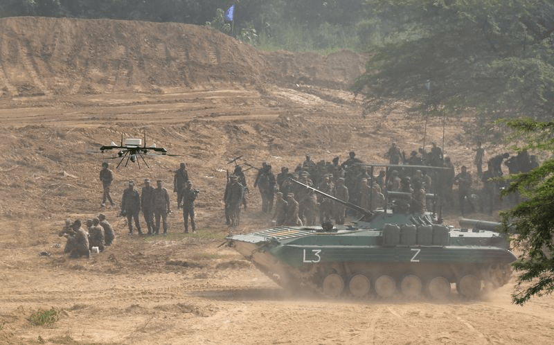 The exercise showcased tactical drones built by both Army units and the domestic defence industry. These drones, capable of carrying a 5 kg payload and operating within a 5 km range, were employed for battlefield reconnaissance, precision strikes, and logistics support.