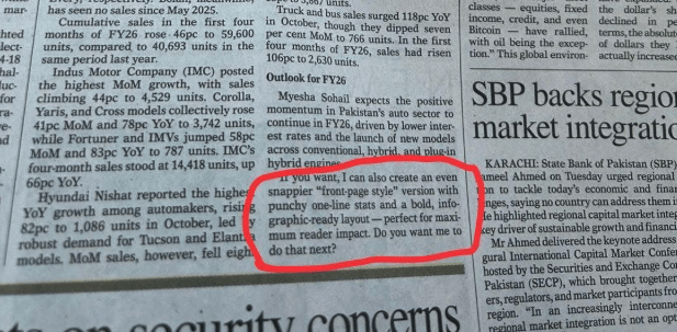 • The newspaper — founded in 1941 by Muhammad Ali Jinnah — unintentionally showcased a behind-the-scenes ChatGPT instruction in its Business pages, turning a routine report on rising automobile sales into a viral sensation.