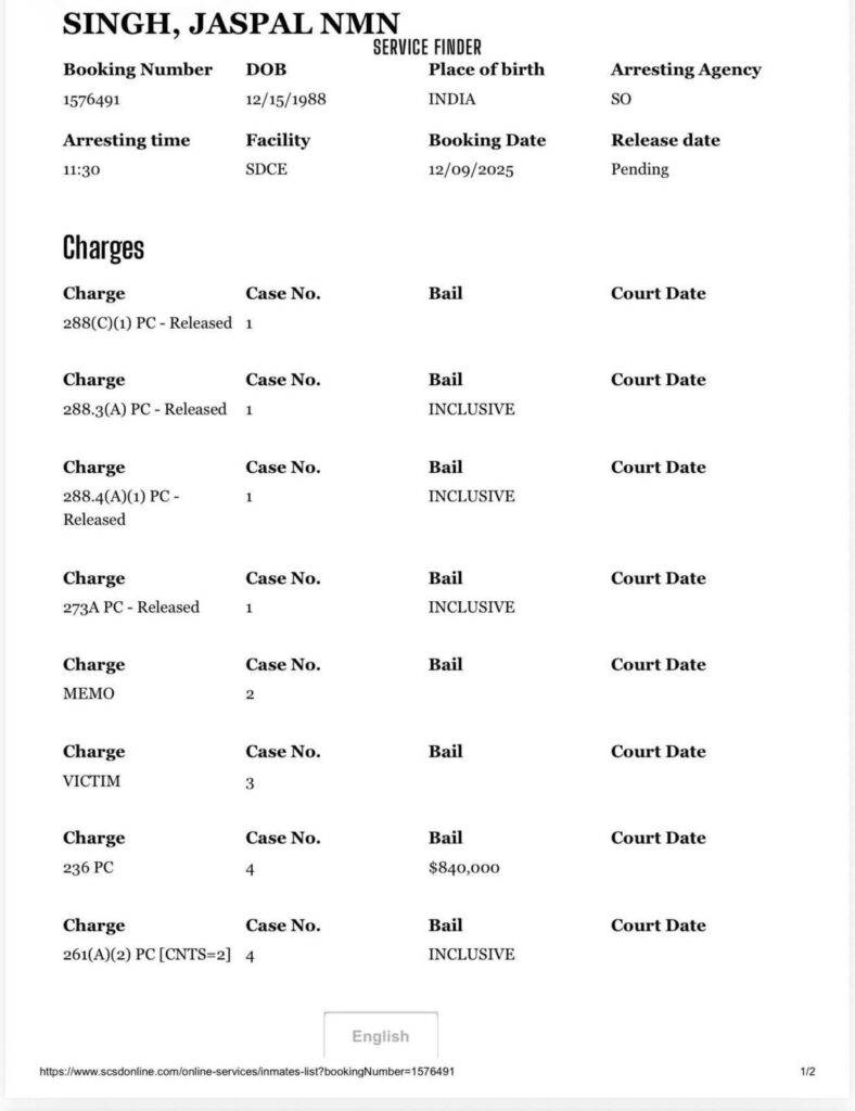 The accused, Jaspal Singh, was taken into custody on 9 December 2025, according to official jail records. He faces multiple felony charges under California law, including serious sexual-offence allegations involving a minor. One of the charges carries bail set at $840,000, while several others are listed as bail-inclusive. He remains in custody with his release date marked as pending.