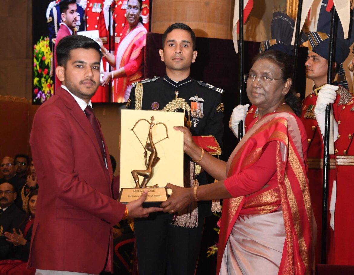 In a glittering ceremony at the Rashtrapati Bhawan, the sporting world witnessed the crowning of a new shooting sensation as Aishwary Pratap Singh Tomar, the prodigious athlete, was bestowed with the esteemed Arjuna Award by President Droupadi Murmu.